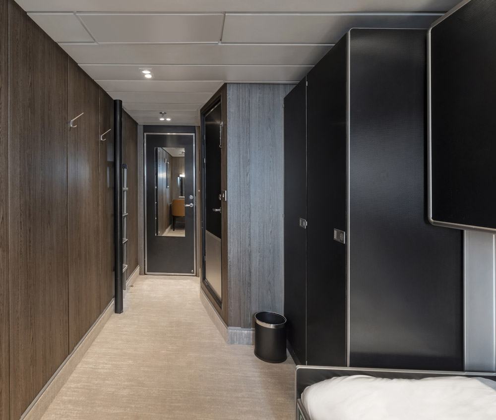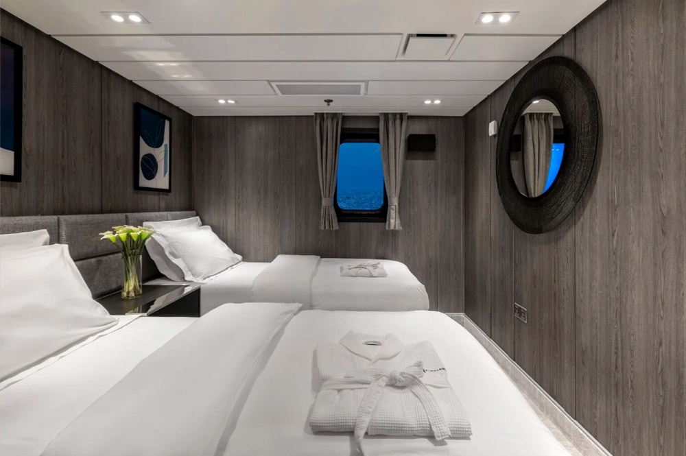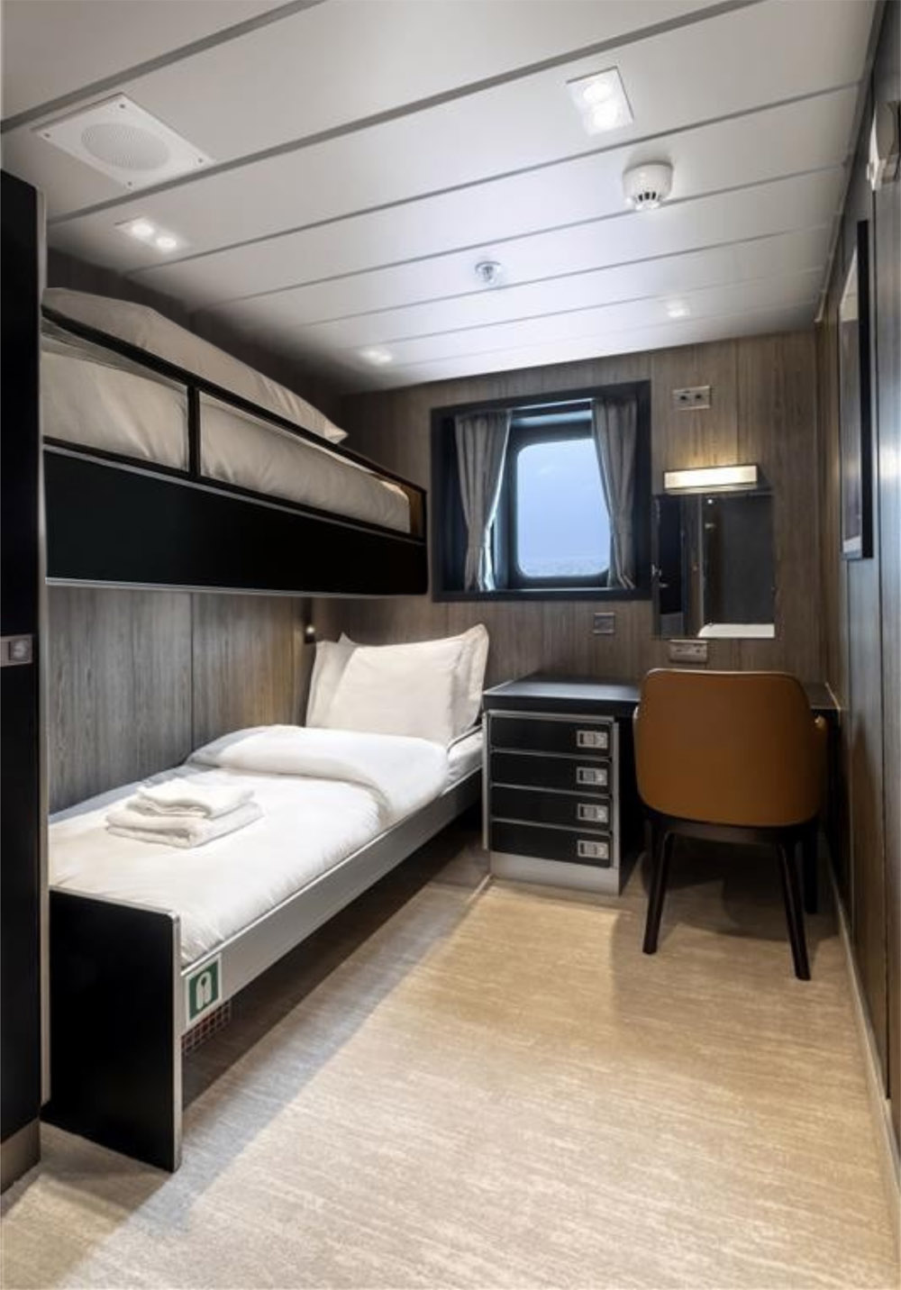 The Triple Cabins located on Deck “A” measure approximately 14 square metres (150 sqft)* and feature a desk, a window, a bunk (pullman style) and one single bed and en-suite bathroom.