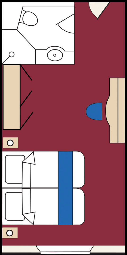 The Deluxe Cabins located on the Promenade Deck measure approximately 15 square metres (162 sqft)* and feature a desk, a window, an en-suite bathroom and one double (King-sized) or two single beds.