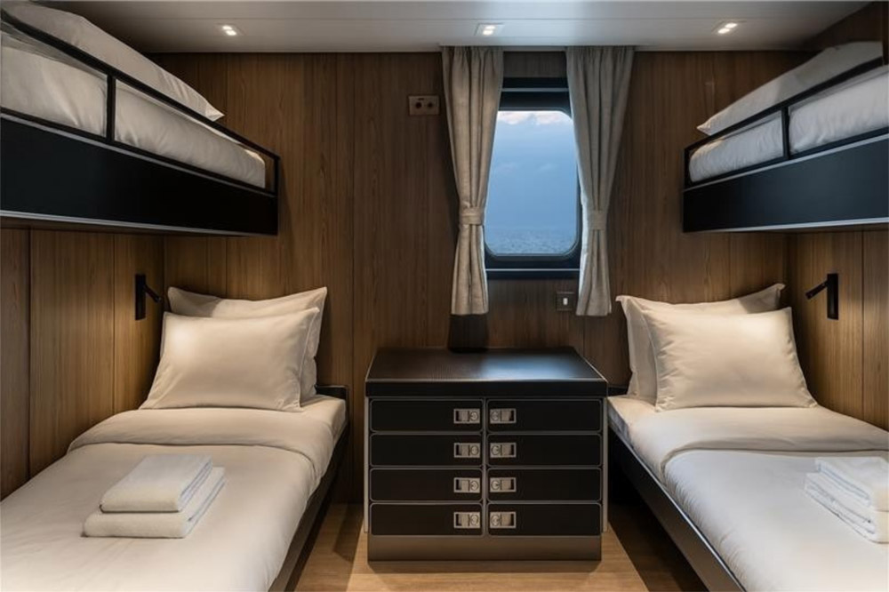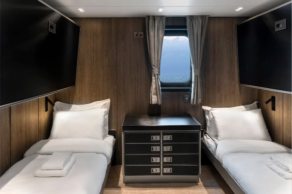 The Quad Cabins located on Deck “A” measure approximately 14 square metres (150 sqft)* and feature a desk, a window, two bunk beds (pullman style) and en-suite bathroom.