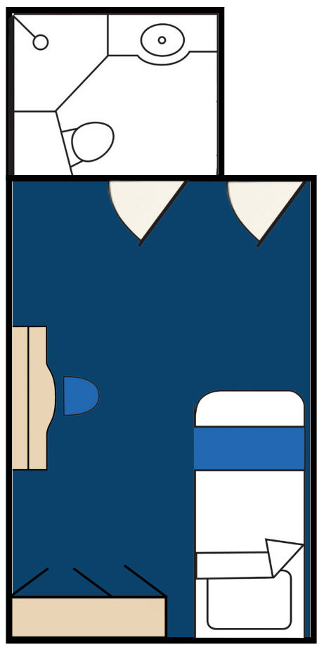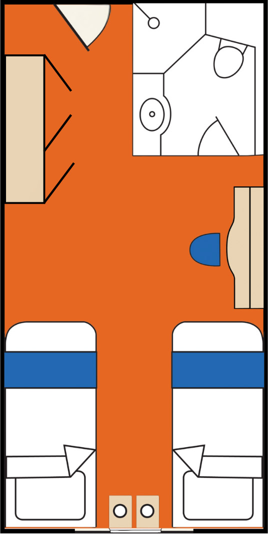 The Odyssey Twin Cabins located on Decks “A” and “B” measure approximately 10 square metres (107 sqft)* and feature a desk, a window, one bunk bed (pullman style) and an en-suite bathroom.