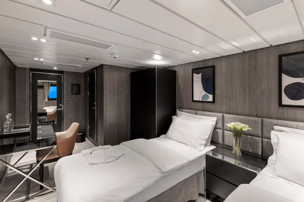 The Superior Cabins located on Decks “A” and “B” measure approximately 14 - 16 square metres (150 sqft)* and feature a desk, a window, two single beds and an en-suite bathroom. Superior Cabins on deck B feature a slightly larger size and a sofa bed and porthole (instead of window).