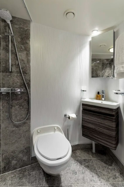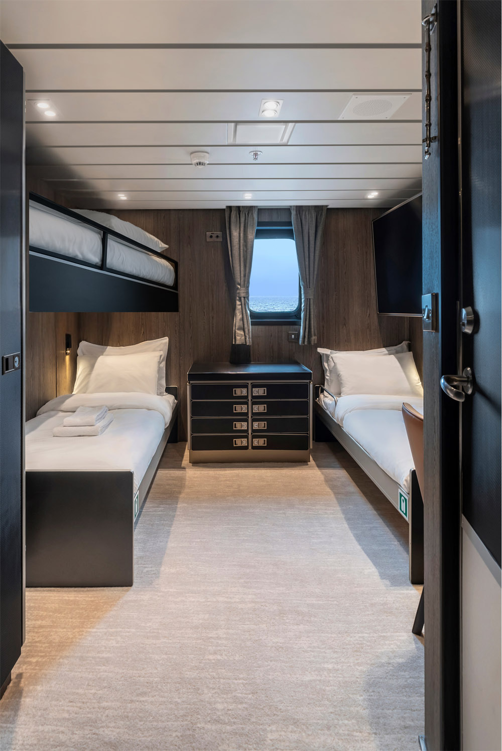 The Triple Cabins located on Deck “A” measure approximately 14 square metres (150 sqft)* and feature a desk, a window, a bunk (pullman style) and one single bed and en-suite bathroom.