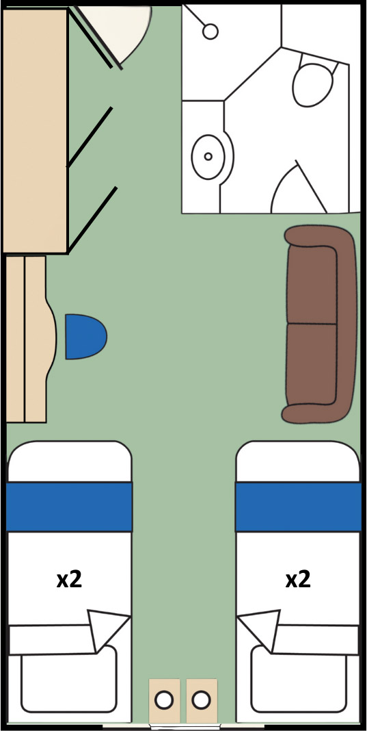 The Quad Cabins located on Deck “A” measure approximately 14 square metres (150 sqft)* and feature a desk, a window, two bunk beds (pullman style) and en-suite bathroom.
