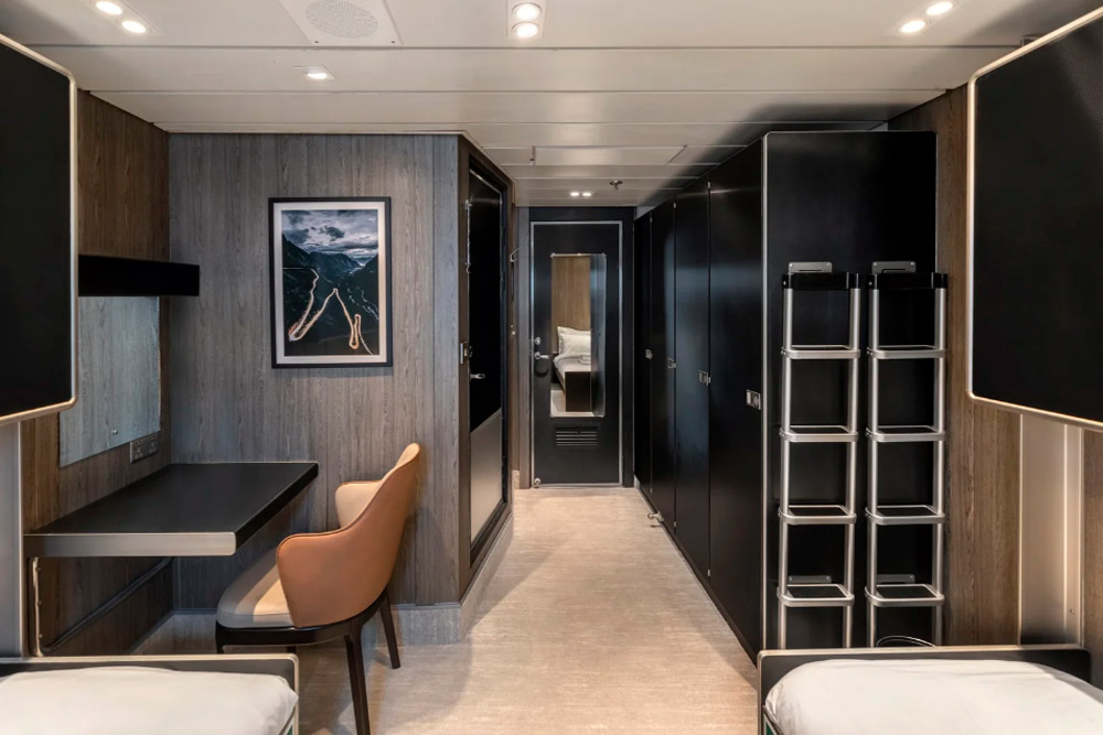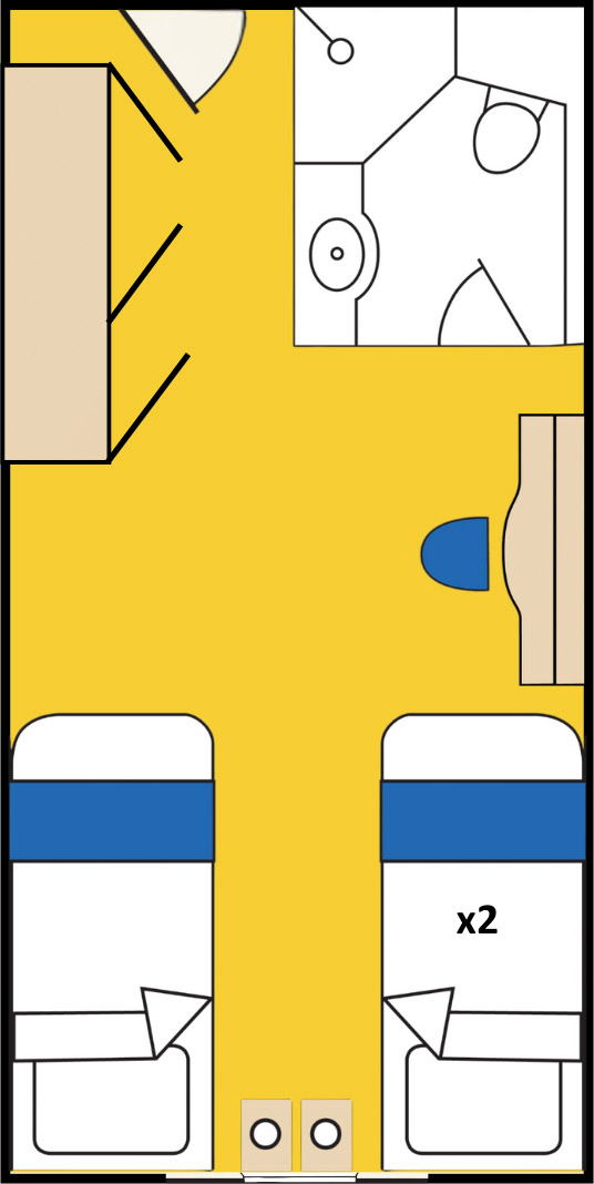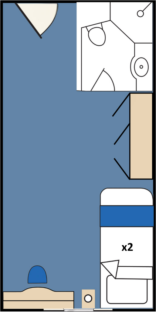 The Odyssey Twin Cabins located on Decks “A” and “B” measure approximately 10 square metres (107 sqft)* and feature a desk, a window, one bunk bed (pullman style) and an en-suite bathroom.