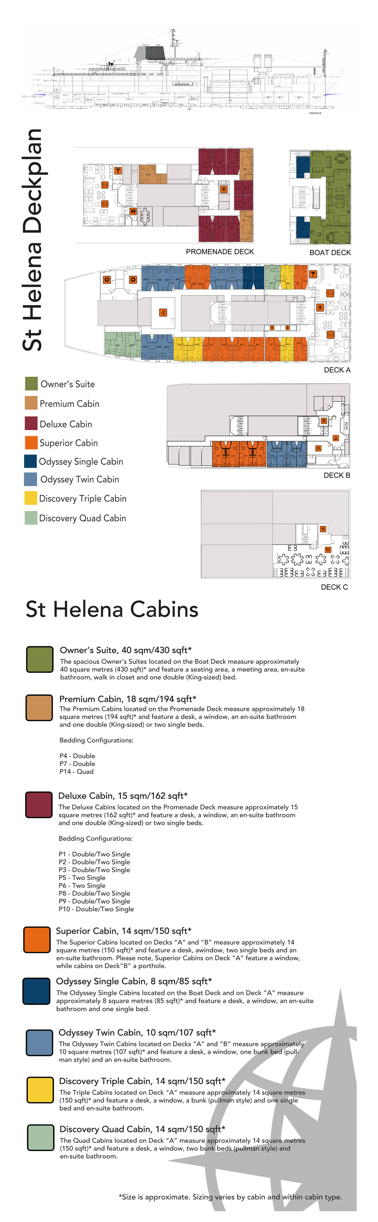 The Deluxe Cabins located on the Promenade Deck measure approximately 15 square metres (162 sqft)* and feature a desk, a window, an en-suite bathroom and one double (King-sized) or two single beds.