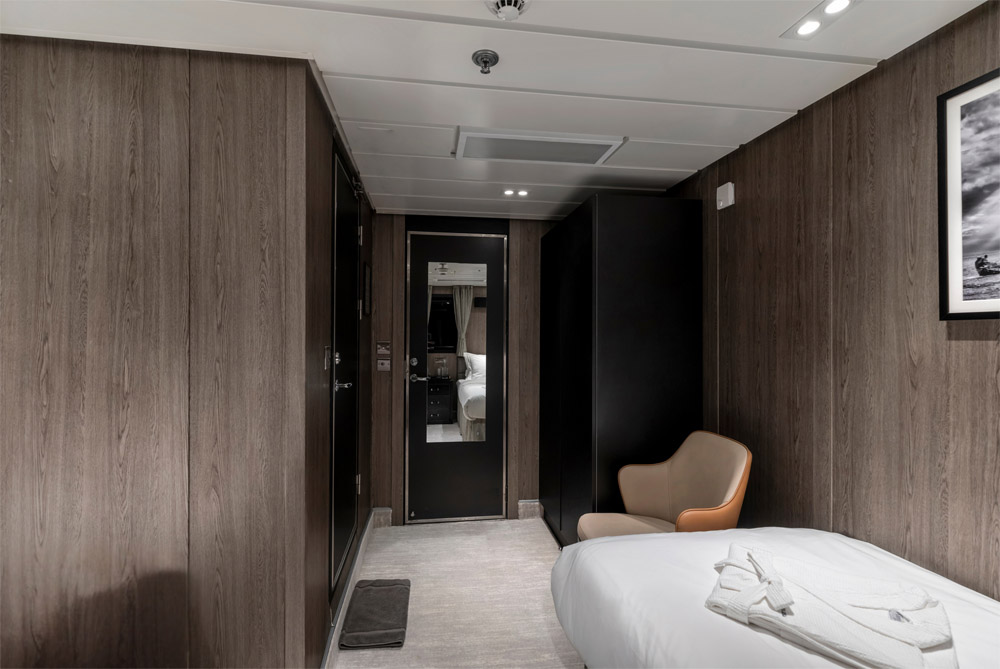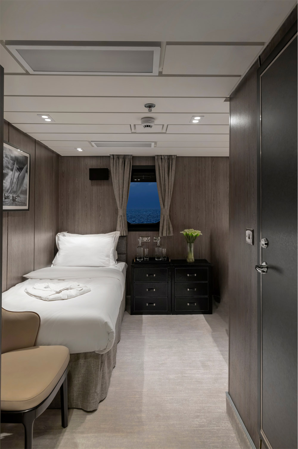 The Odyssey Single Cabins located on the Boat Deck measure approximately 8 square metres (85 sqft)* and feature a desk, a window, an en-suite bathroom and one single bed.